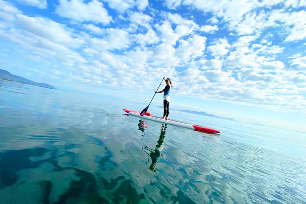 SUPとはスタンドアップパドルボードの略で、専用のボードに乗りパドルで漕いで進むウォータースポ―ツです。